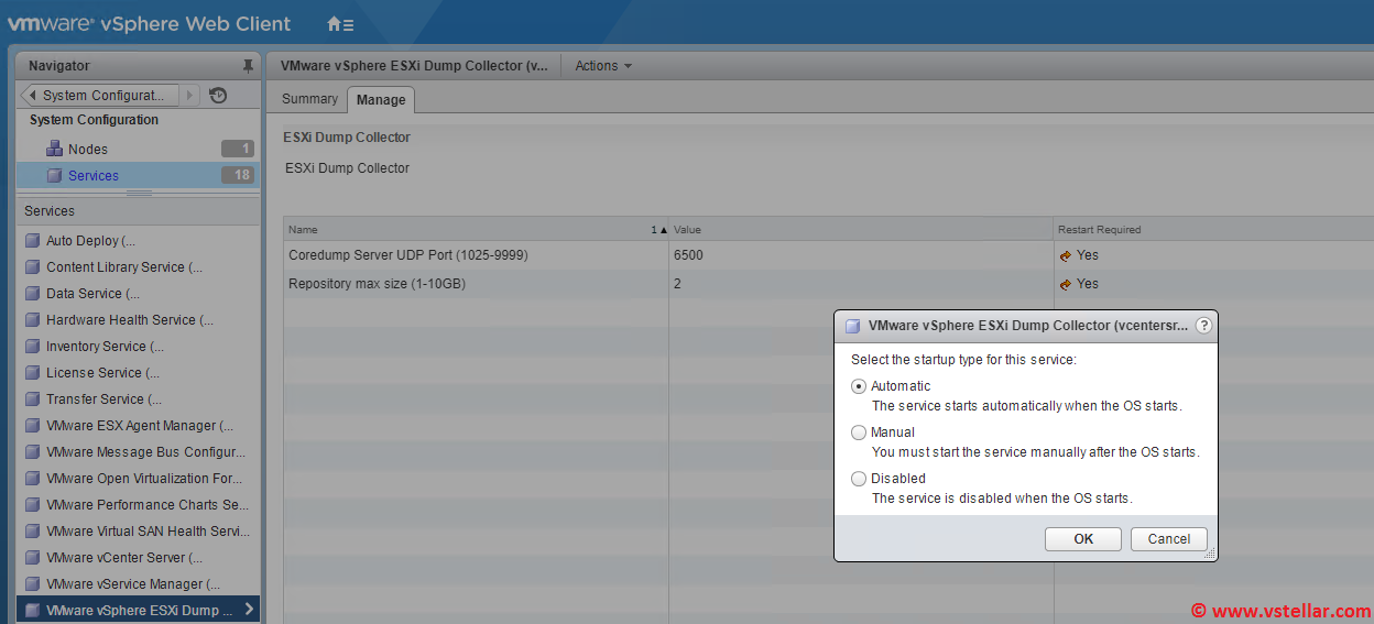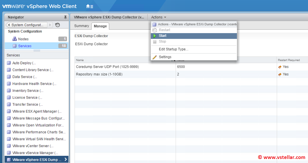 To do so login to vCenter Web-Client and navigate to Home > Administration > System Configuration > Services and select the Esxi Dump Collector service and click on Actions tab to enable the service.