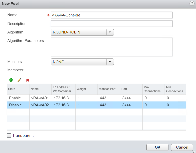 - Algorithm: vRA Load Balancer documentation recommends to use Least connections, but Round Robin works just fine.
