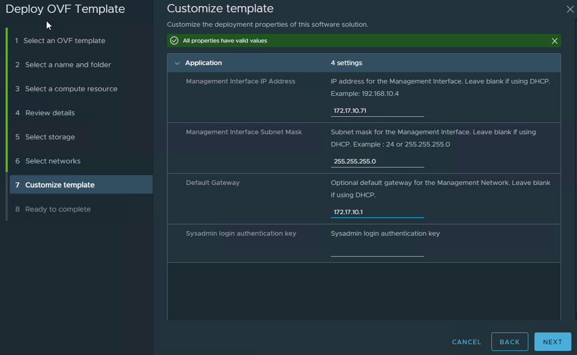 Ova deployment is straight forward and I am not covering the deployment wizard. Make sure to leave the Sysadmin login authentication key field blank when deploying controller ova.