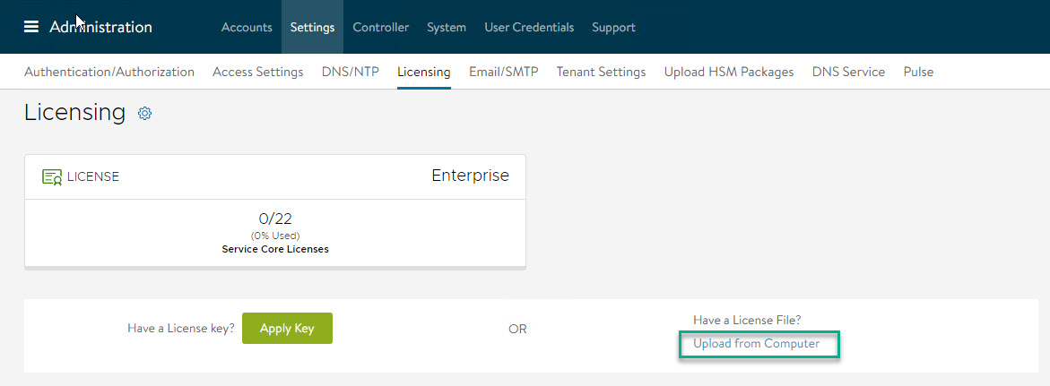 To assign license to Avi controller, navigate to Administration > Settings > Licensing and apply license key or license file by clicking on upload from computer.