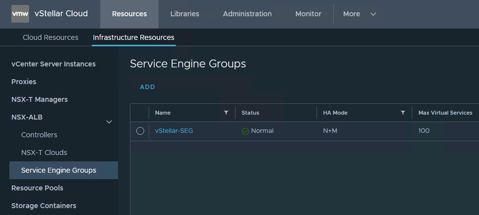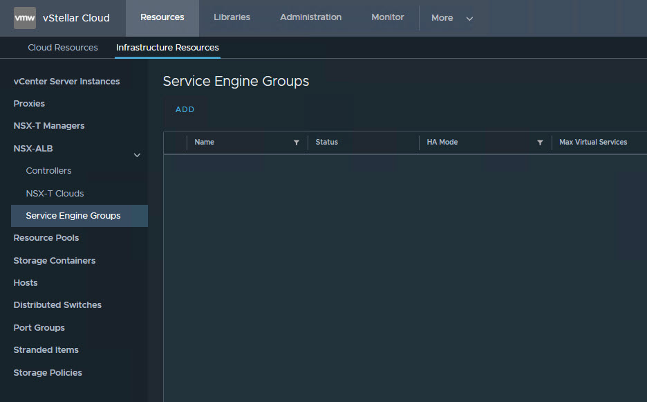 To import an SEG in VCD, login to VCD using the system admin account and navigate to Resources > Infrastructure Resources > NSX ALB > Service Engine Groups, and click on the ADD button.