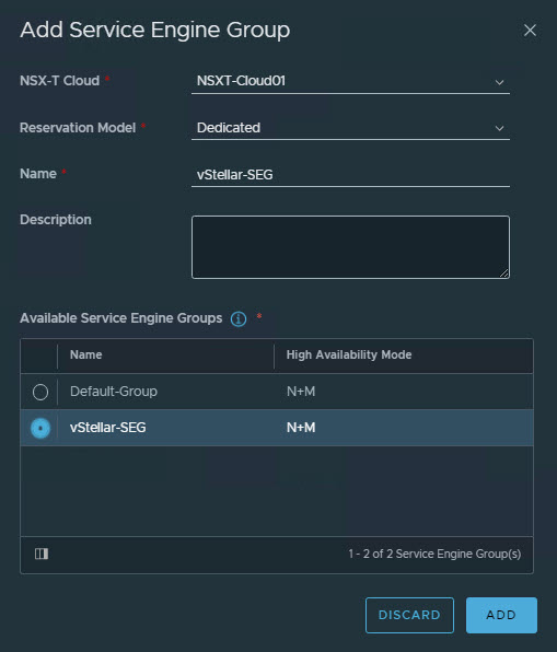 Service Engine Groups are created in the NSX ALB Console in the default admin tenant. The SEGs are then imported into VCD by the Service Provider. The supported import types are: