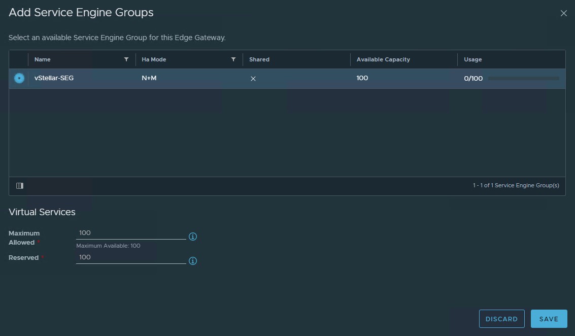 At this point, it is assumed that a Service Engine Group has been created in NSX ALB and the Controller is already integrated into VCD.