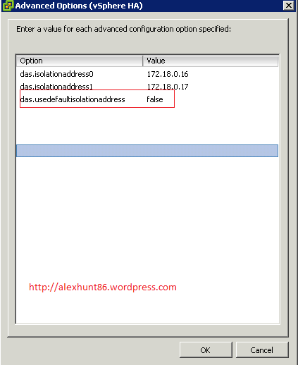 2: das.usedefaultisolationaddress:– this option has 2 values: True or False. When set to false a host will NOT use the default gateway as an isolation address. This may be useful when the default gateway of your host is an unpingable address, or a virtual machine, such as a virtual firewall