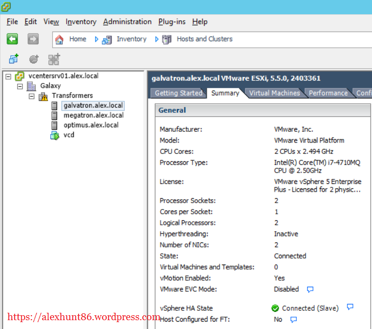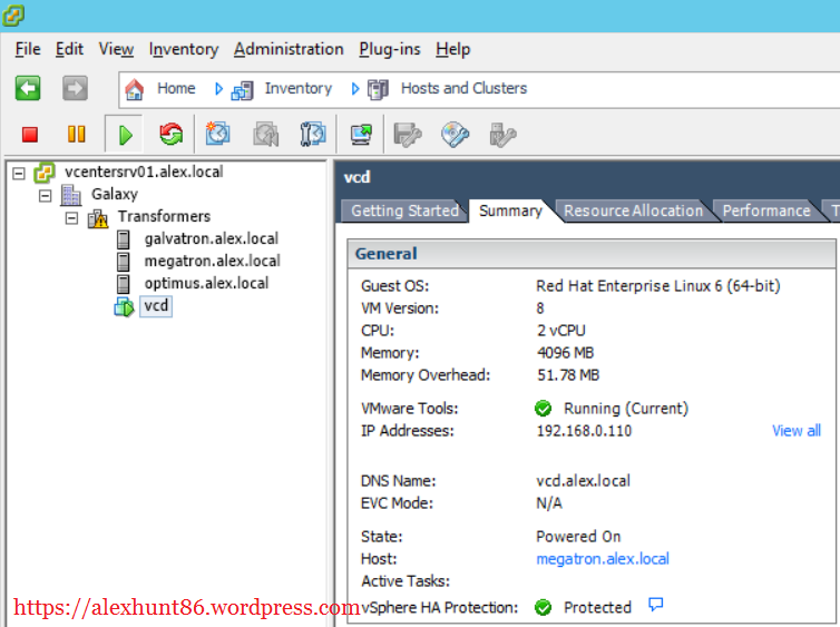 | vCenter Server | vcentersrv01.alex.local | 192.168.0.10 | NA |