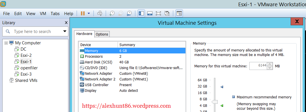 - I installed openfiler version 2.99 as virtual machine. The resources allocated to this VM are 2 vCpu and 3 GB RAM. Also I have added 2 additional disks which are presented as iSCSI LUN’s to my Esxi Hosts.
