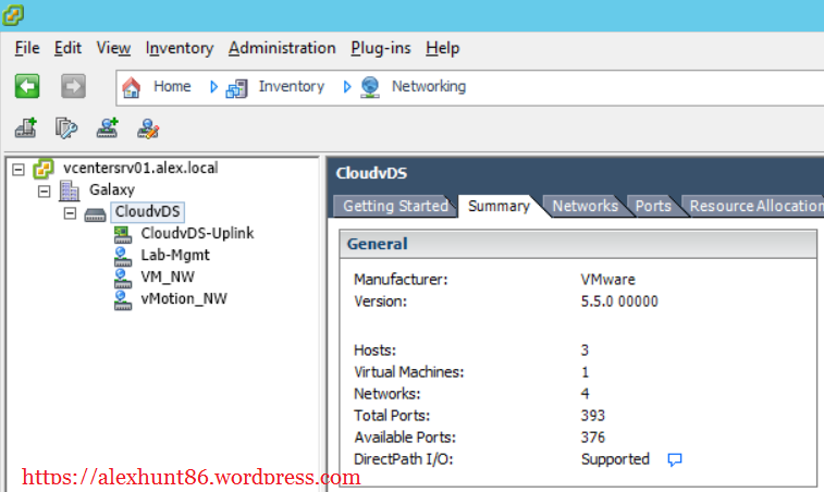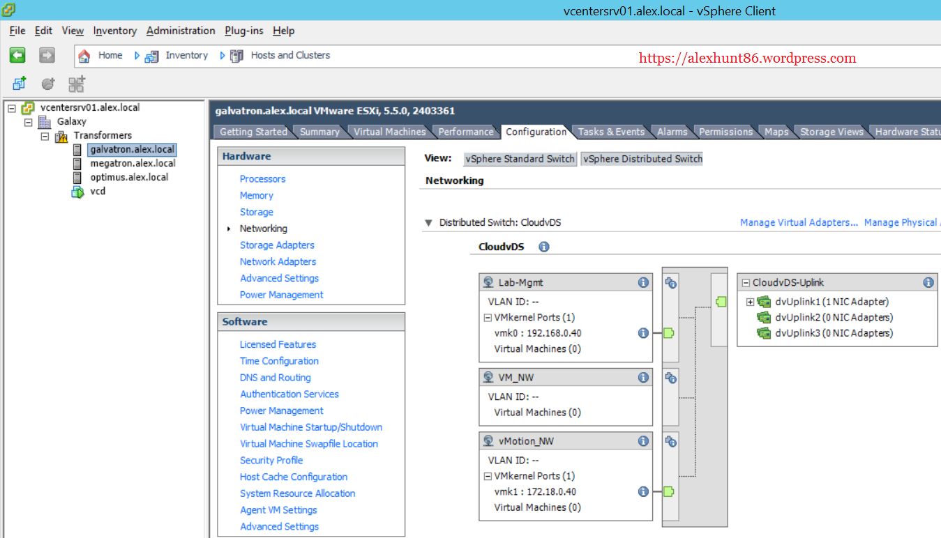 c) I have vDS created and port-groups configured. There are 3 port-groups which I created on my vDS: Lab-Mgmt, VM_NW and vMotion_NW. Pretty clear from name what is the purpose of these port-groups.