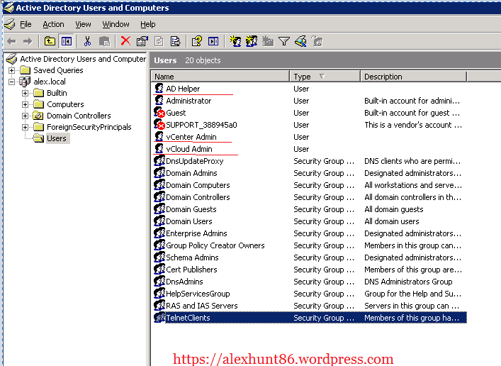I am using dedicated user accounts for my cloud lab. I have created following user accounts in my AD