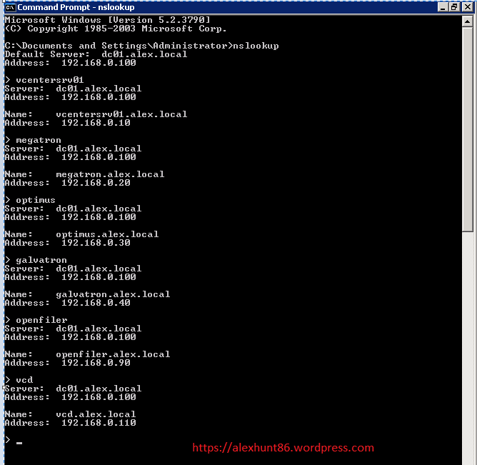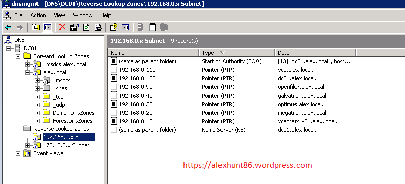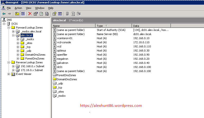 I have my DNS Server configured at very first place before start building any component in my Home Lab. My DNS server (AD included) is running on Server 2003 Enterprise edition. I have configured my domain as “alex.local” and created both forward and reverse lookup zone in my DNS.