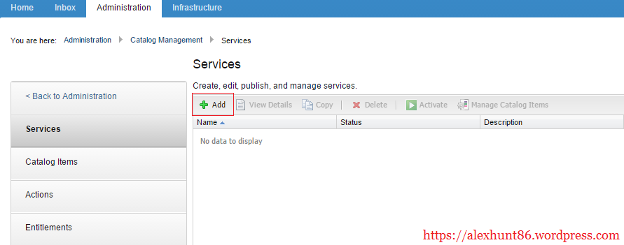 Navigate to Administration -> Catalog Management -> Services. Click on the “+” sign to add a new service.