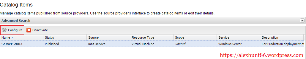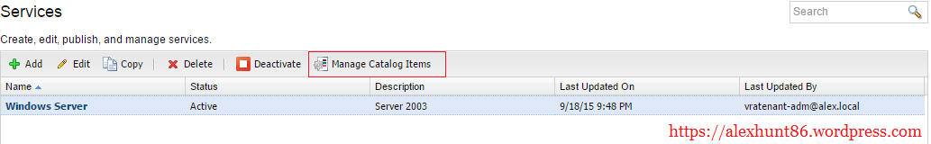 The newly created service will be visible under services. select the service and click on “Manage Catalog Item”