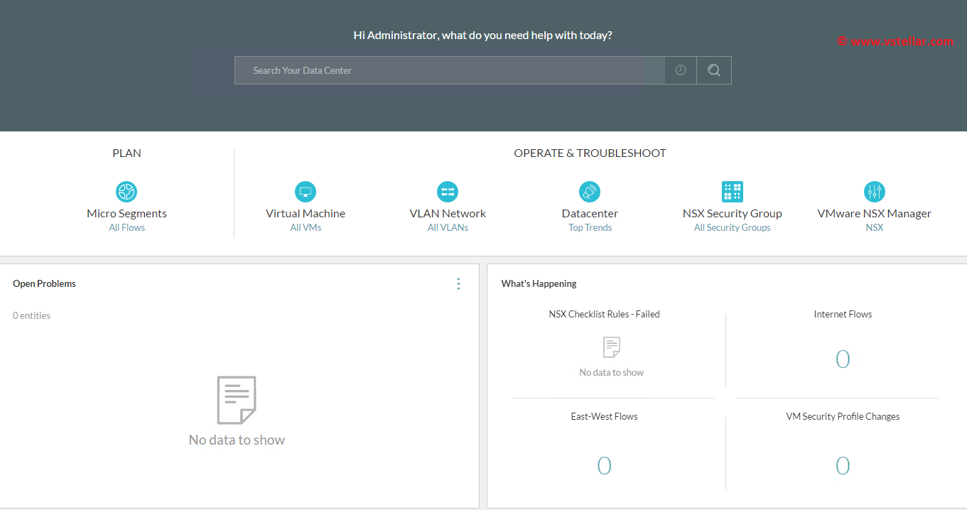 Below screen shows you the dashboard where you can check and monitor various things of your NSX powered environment. This dashboard is empty as of now because we have not added any endpoints yet.