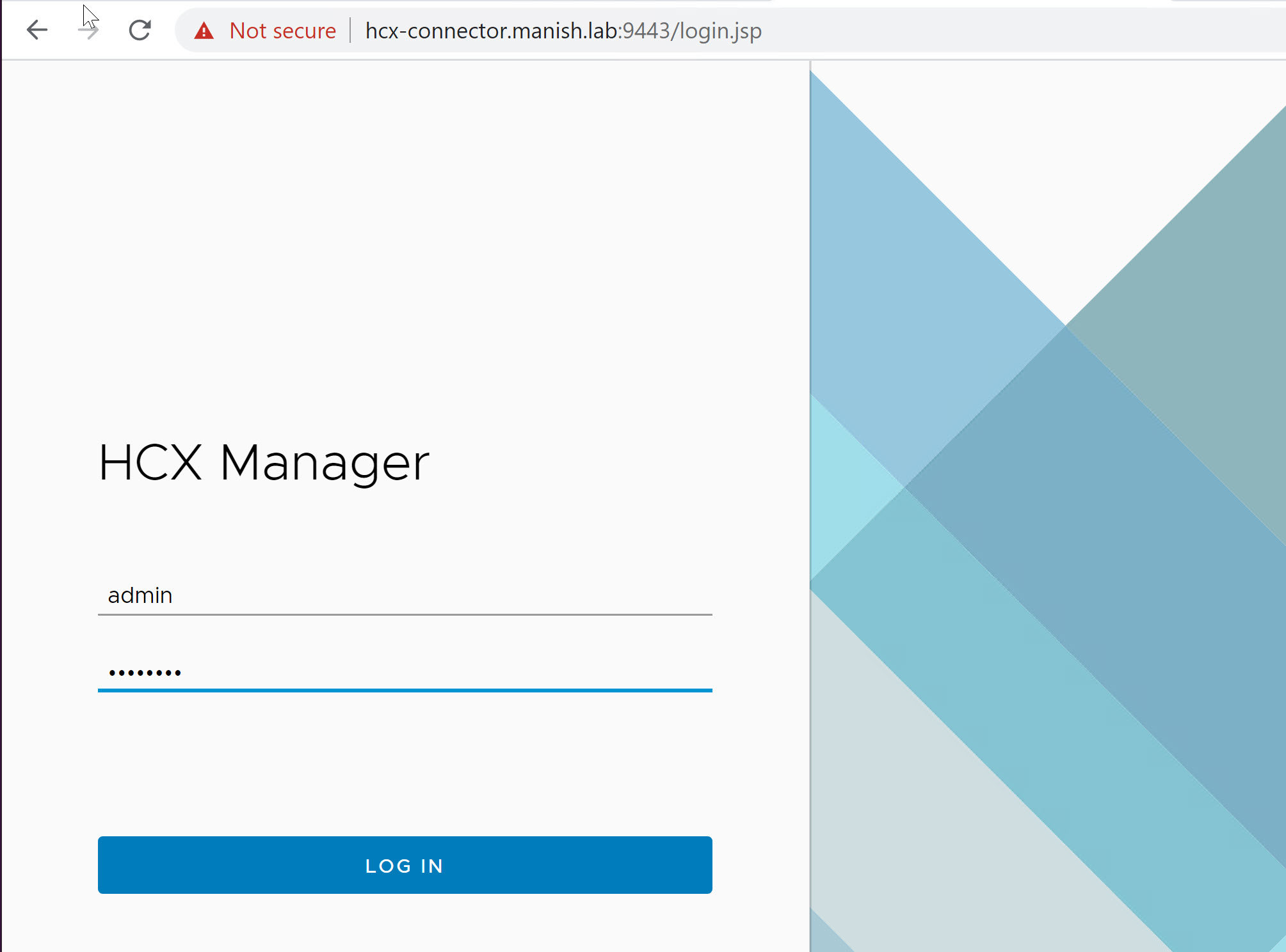 Once the appliance boots up, login to the appliance by typing https://hcx-fqdn:9443 and using admin as the username and password set during deployment.