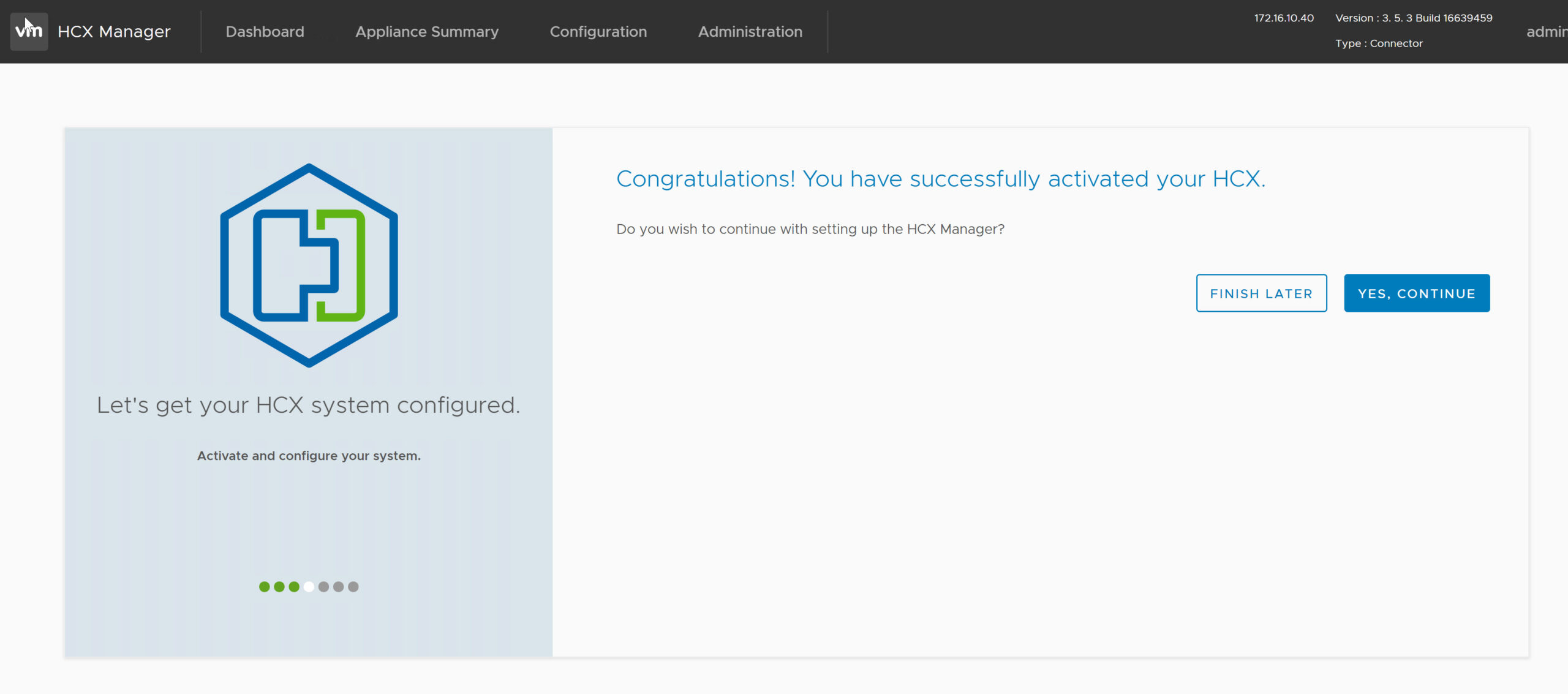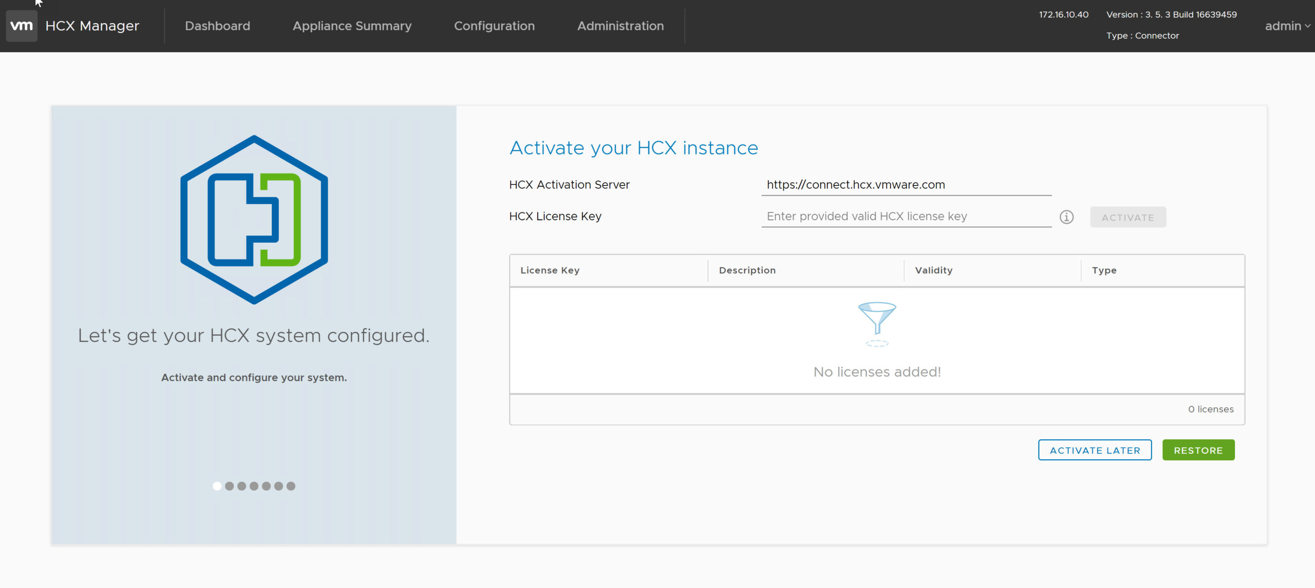 You need to have your HCX license key handy for activating the appliance. Your appliance should be able to connect to https://connect.hcx.vmware.com to get activated.