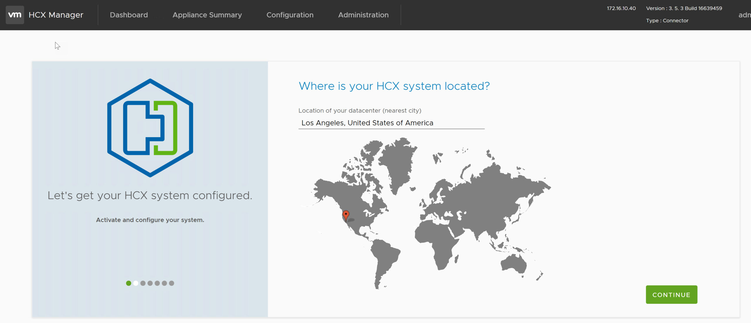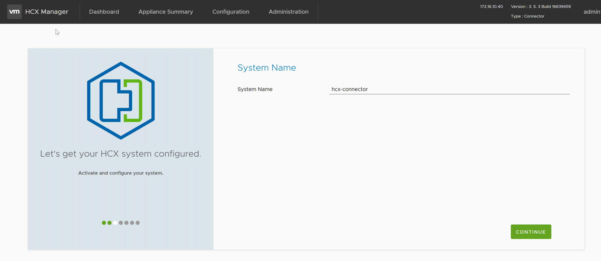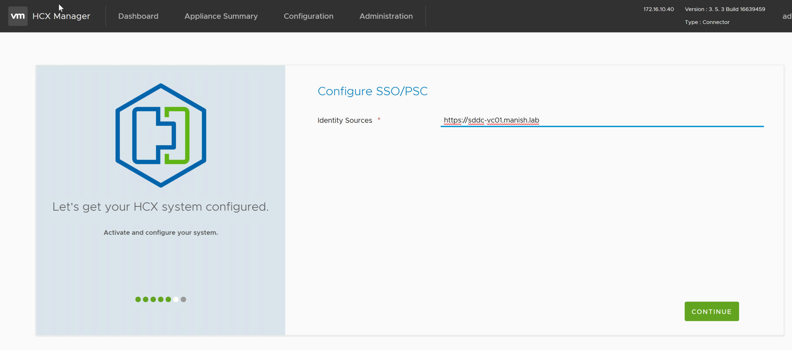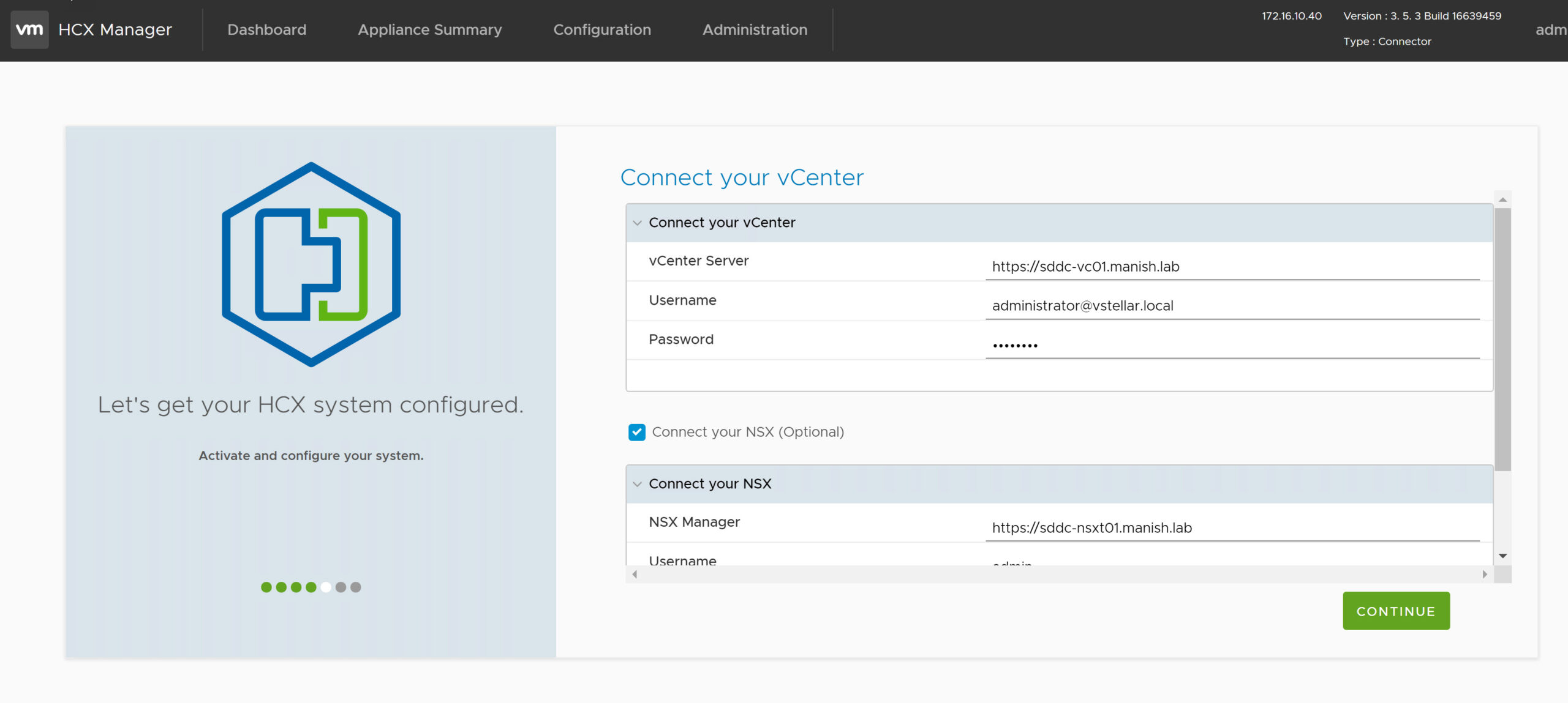 Next, connect your on-premise vCenter server and NSX manager with HCX. Provide the information, and click continue.