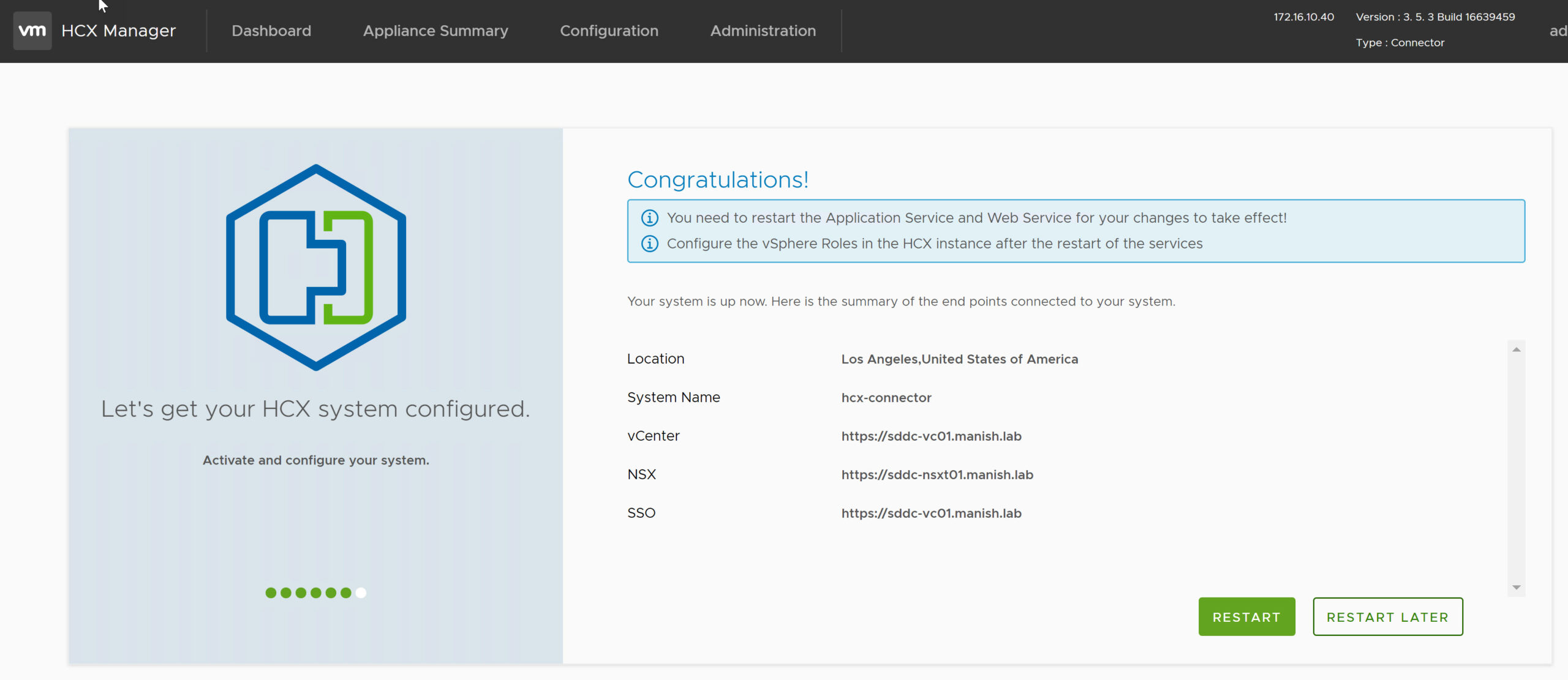 Restart the HCX application service by clicking on the Restart button for configuration changes to take effect.