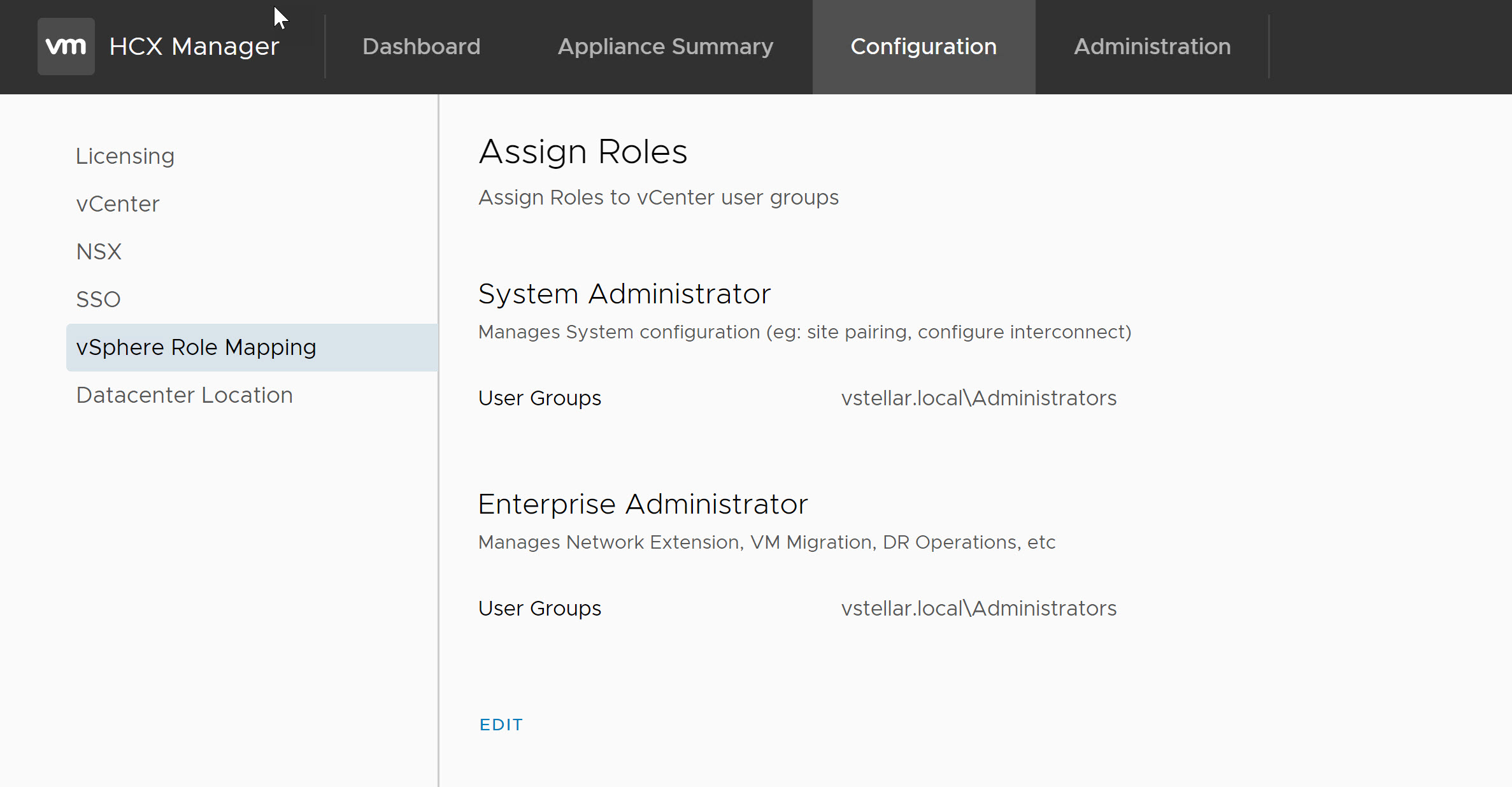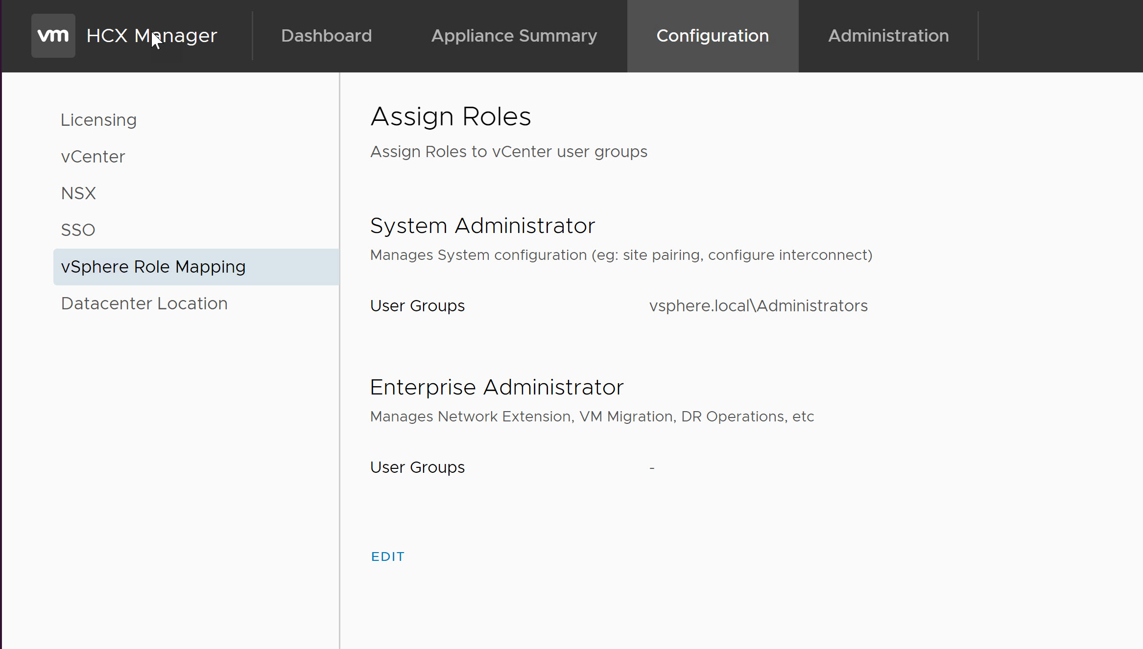 Next is to do vSphere role mapping, which is a very important step. You are configuring users/groups who can manage the HCX appliance. By default, it is set to vsphere.local/Administrators.