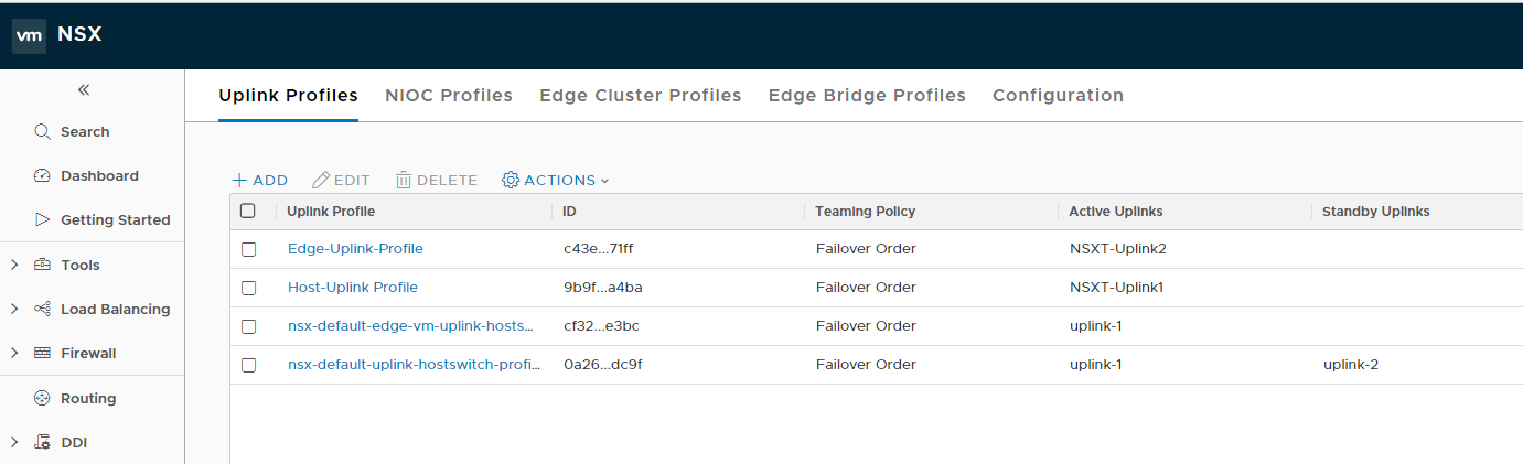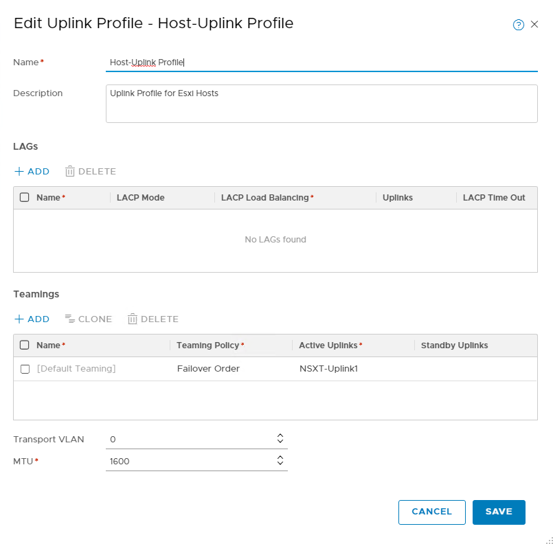 I created two uplink profiles in my lab, one for the ESXi host and the other for the edge VMs that will be deployed later.