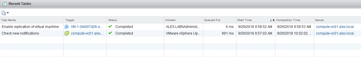 At this moment, the replicated VM will be registered as a regular VM in vCenter (not as a shell VM) and also in vCloud Director.