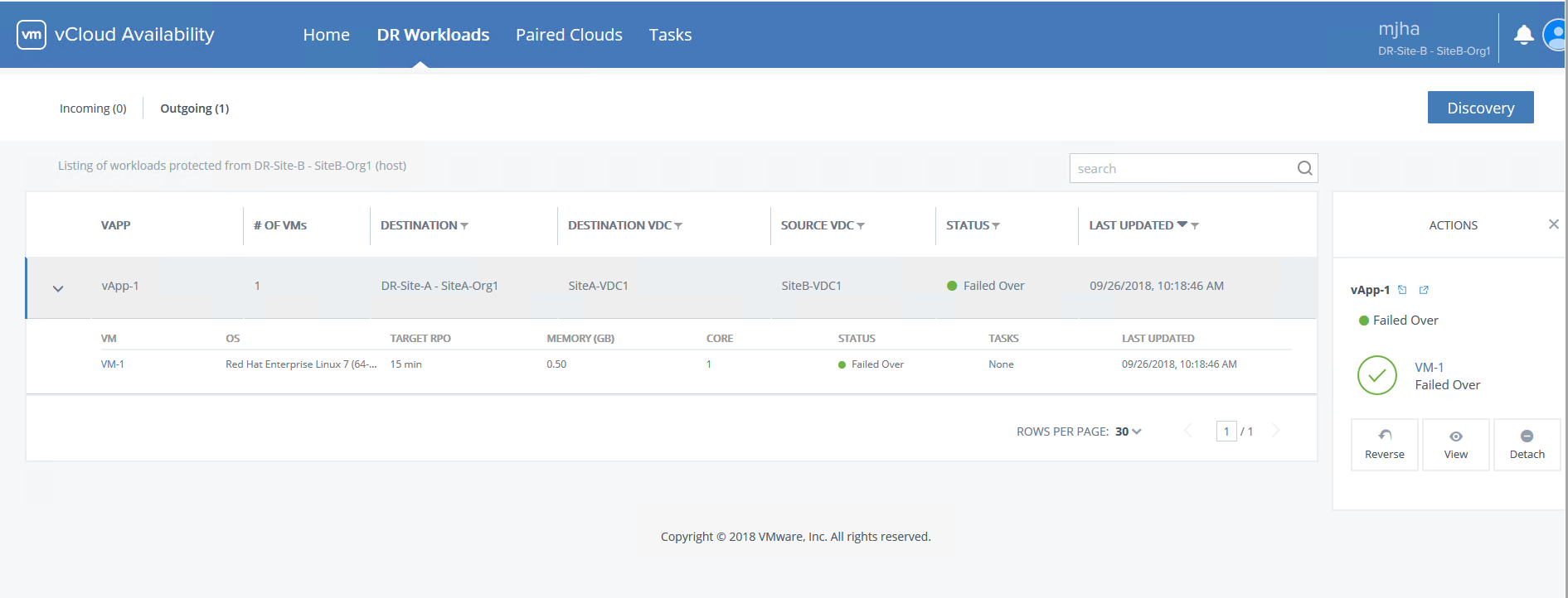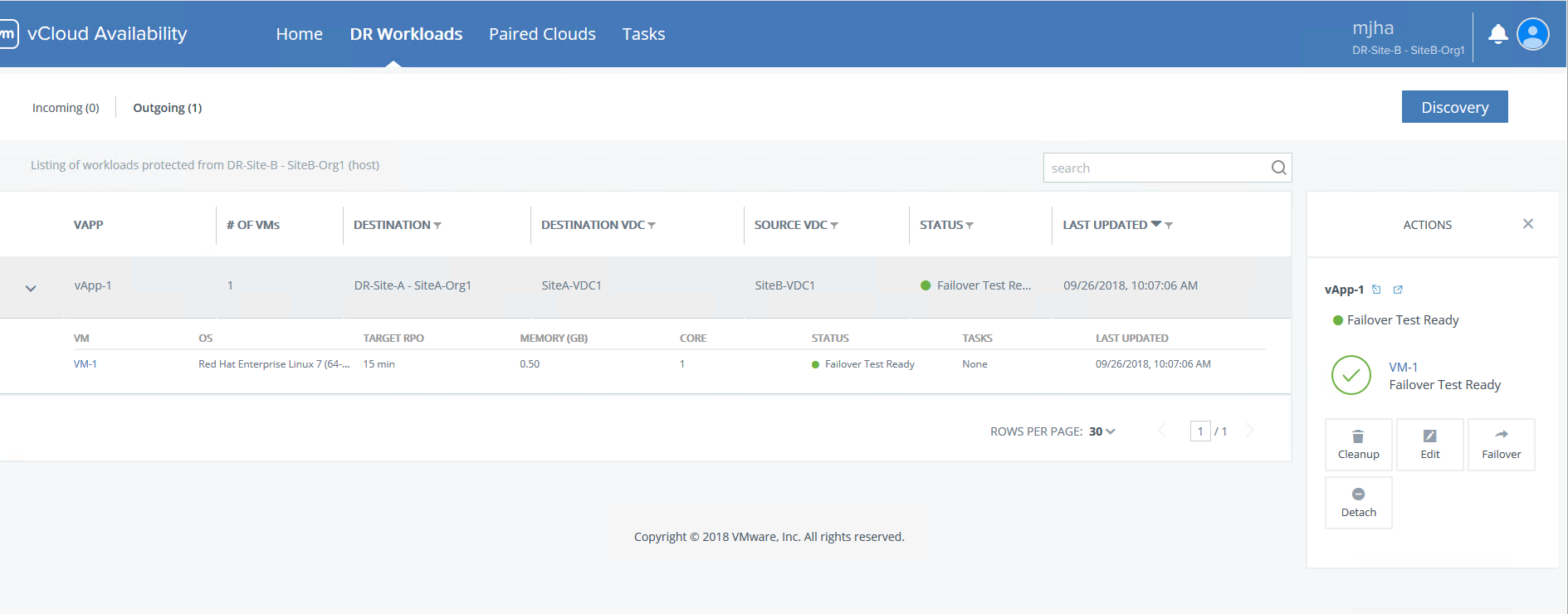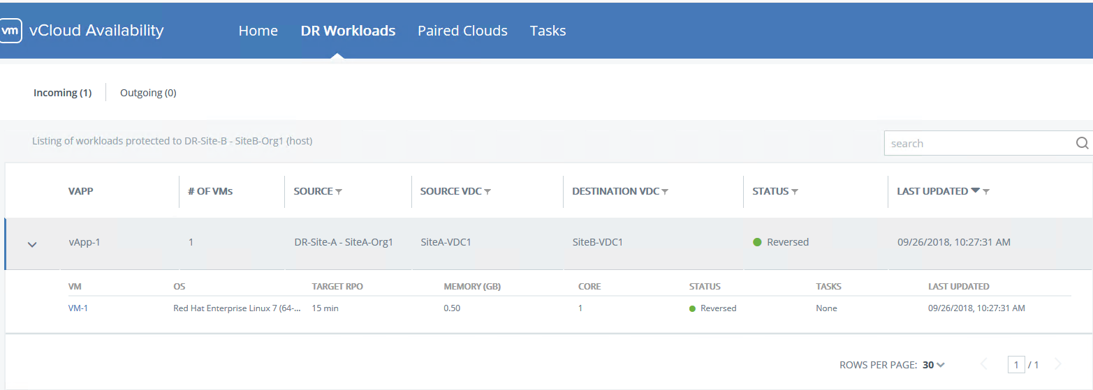To start testing DR operations, connect to https://VCAV-FQDN:8443 and login with tenant credentials (uname@orgname) and navigate to Paired Clouds.