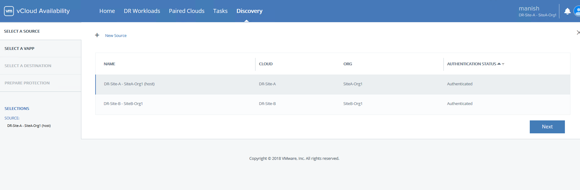 Select the source site from where replication will be initiated. You can select any site from here as a source. No need to login to the Site B appliance to use it as a source.