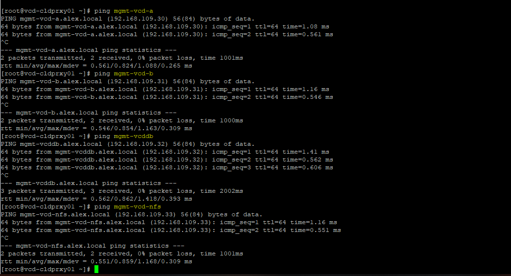 [root@vcd-cldprxy01 ~]# mount -a [root@vcd-cldprxy01 ~]# df -h | grep /opt/vmware/vcloud-director/data/transfer 192.168.109.33:/data 36G 1.9G 34G 6% /opt/vmware/vcloud-director/data/transfer |