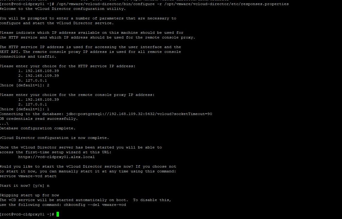 # /opt/vmware/vcloud-director/bin/configure -r /opt/vmware/vcloud-director/etc/responses.properties |
