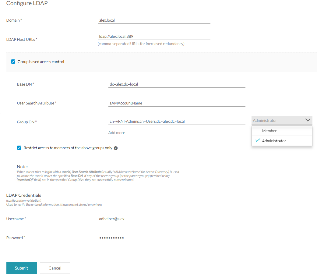 Under LDAP credentials, punch in the username/password of the user via which vRNI can query your Active Directory and hit Submit.