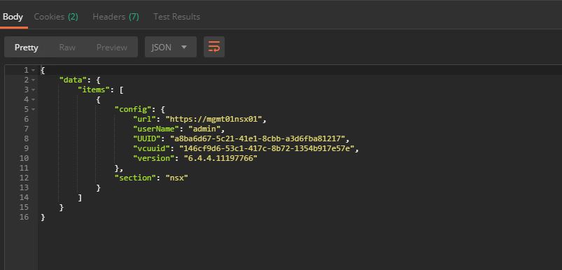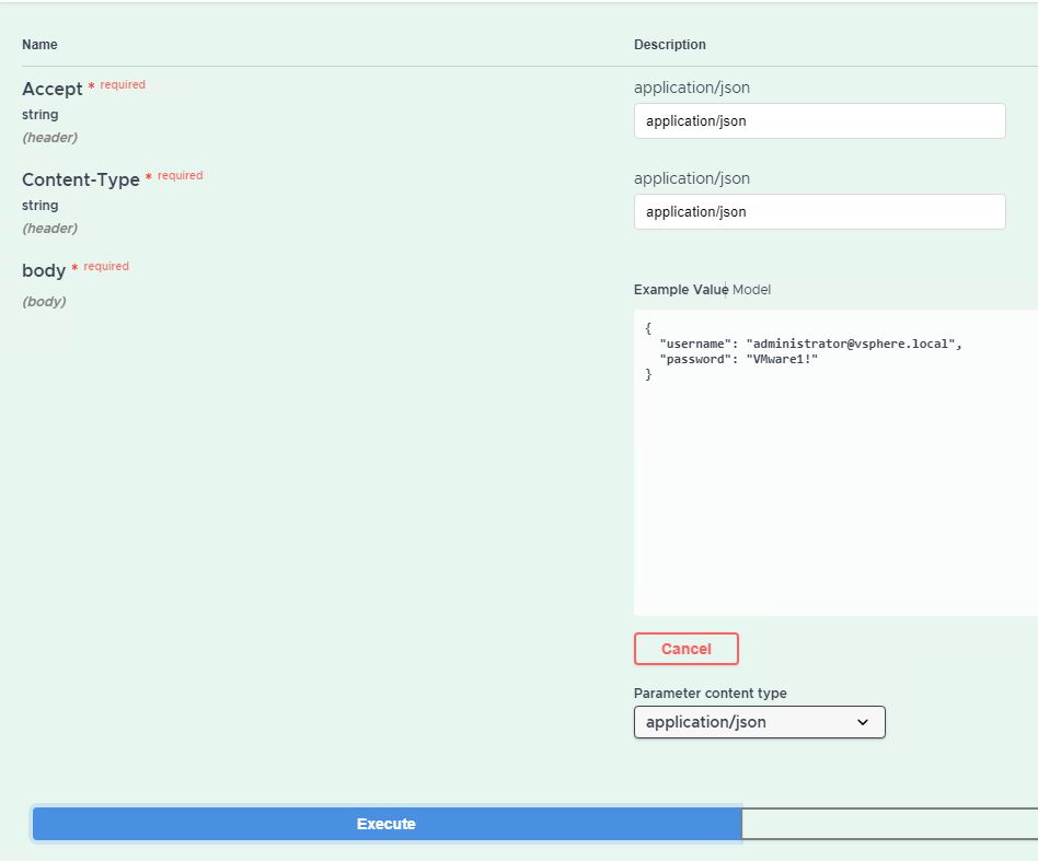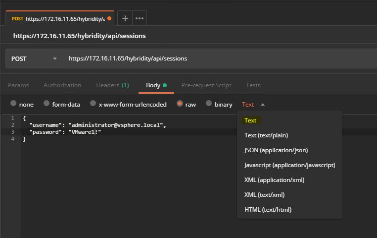Switch to the Body tab, select type as text, and paste punch in your vSphere credentials that you have configured in HCX.