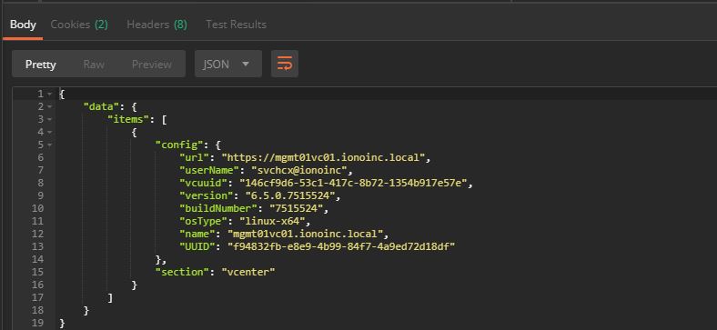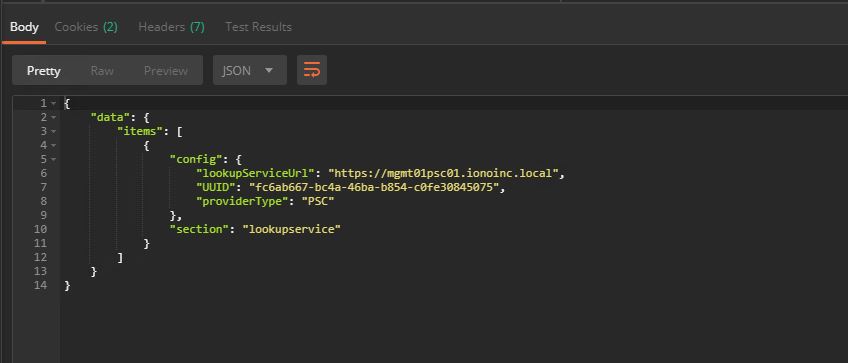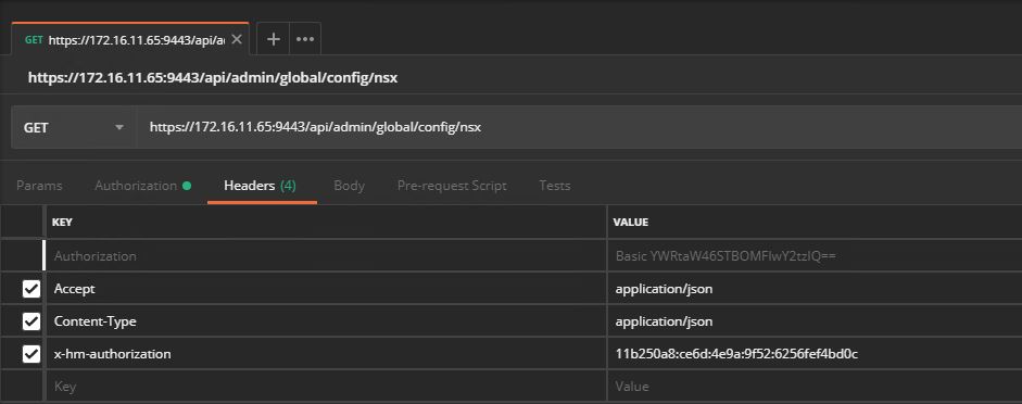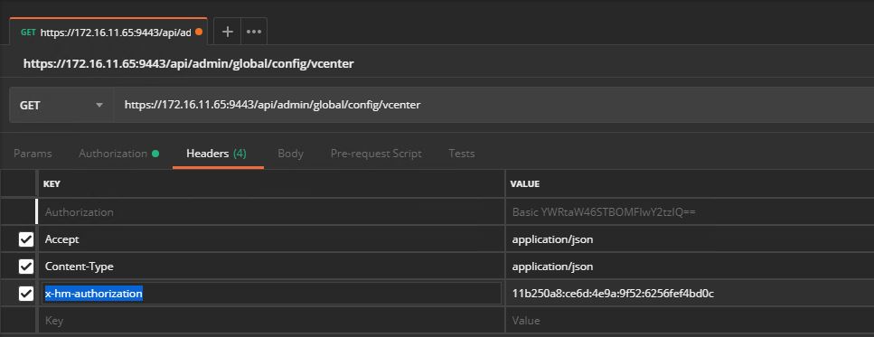 Method: GET URL: https://<hcx-ent-fqdn>/api/admin/global/config/vcenter Authorization: No Auth Headers: Accept: application/json, Content-Type: application/json, x-hm-authorization: Auth token obtained earlier |