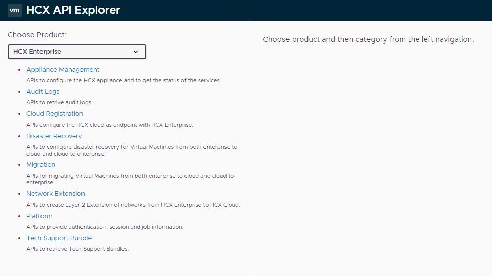 HCX has its own API explorer (similar to the vSphere swagger interface). You can use additional tools like Postman or Curl to explore the capabilities of the HCX API.