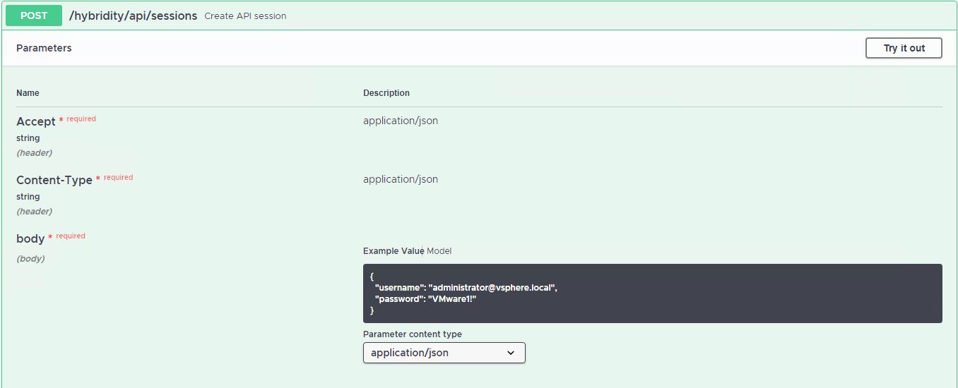 Click on the “Try it out” button, and it will allow you to punch in your HCX manager username/password.