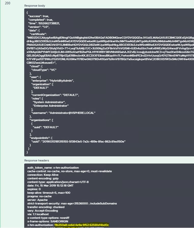 On hitting the execute button, you will get back a token called x-hm-authorization, which needs to be included in all subsequent HCX API calls.