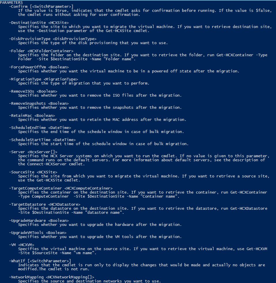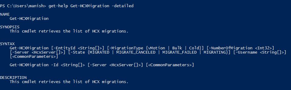 To see the complete list of parameters that can be passed with the Get-HCXMigration cmdlet, run the command “get-help Get-HCXMigration -detailed“