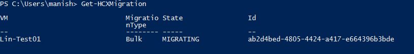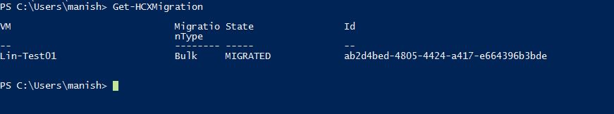 PS C:Usersmanish> Get-HCXMigration -Id 272594ca-409a-470d-a7fe-c0856d061190 VM Migratio State Id nType -- -------- ----- -- Lin-Test01 Bulk MIGRATED 272594ca-409a-470d-a7fe-c0856d061190 |
