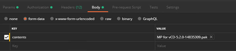 Method:POST URL:https://<vrops-fqdn>/casa/upgrade/cluster/pak/reserved/operation/upload?pak_handling_advice=CLOBBER&force_content_update=true Auth:Basic:vROPS-User/Password Headers:Accept:application/json Body:form-data,key:contents,value:MPfilename |