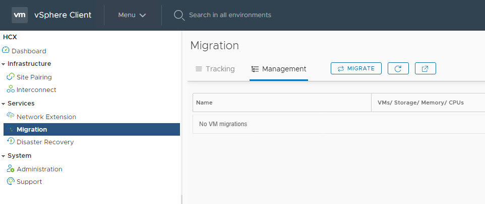 Login to on-prem vSphere Client and switch to HCX context from main menu and navigate to Migrations page and click on Migrate to start configuring migration.