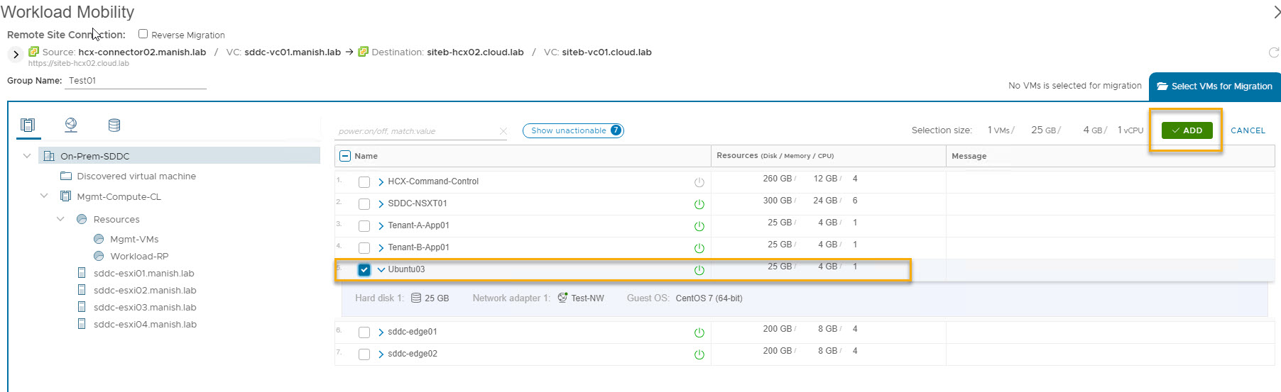 Select the vm which you want to migrate and click on Add.