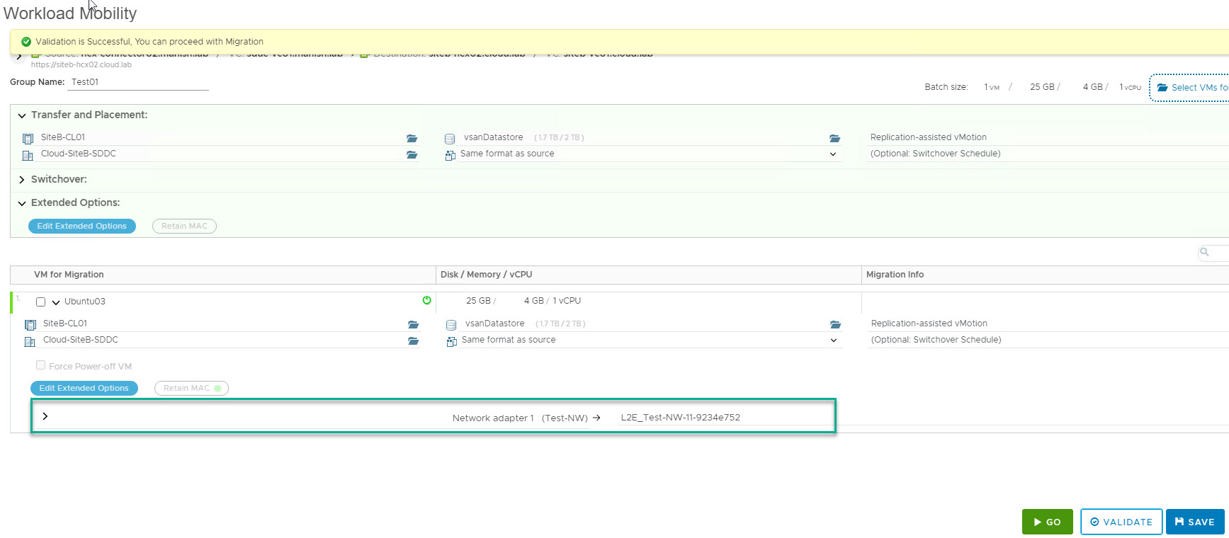 Note: The vm I selected in my lab is placed on a network which has been stretched to HCX cloud site using Network Extension feature.