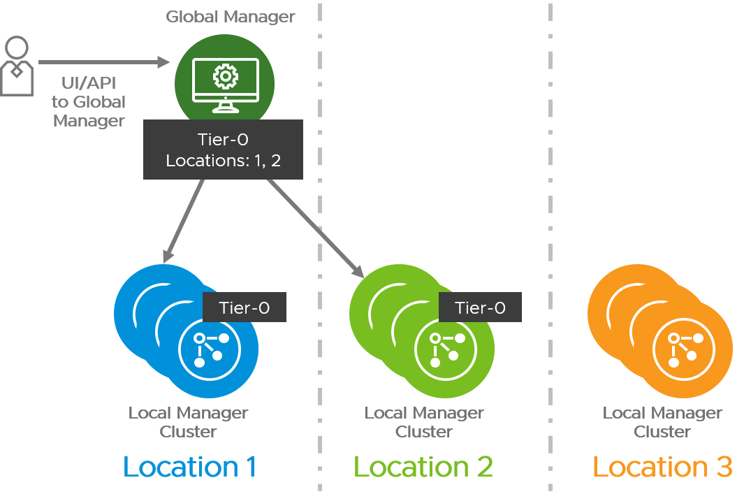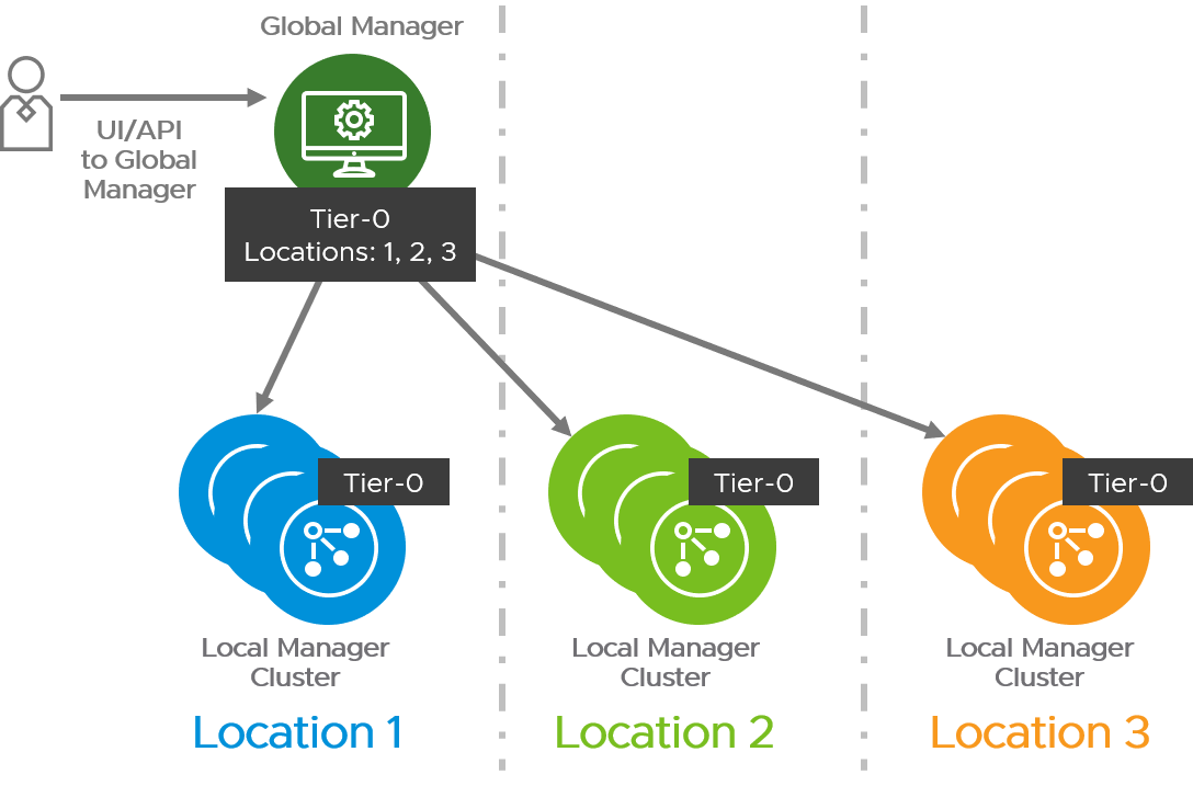 With the NSX-T Federation, the concept of a Global Manager (GM) is introduced, which enables a single pane of glass for all connected NSX-T managers. A global manager is an NSX-T manager deployed with the role “Global”. Objects created from the Global Manager console are called global objects and pushed to the connected local NSX-T Managers.