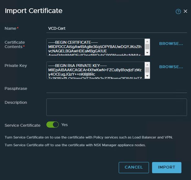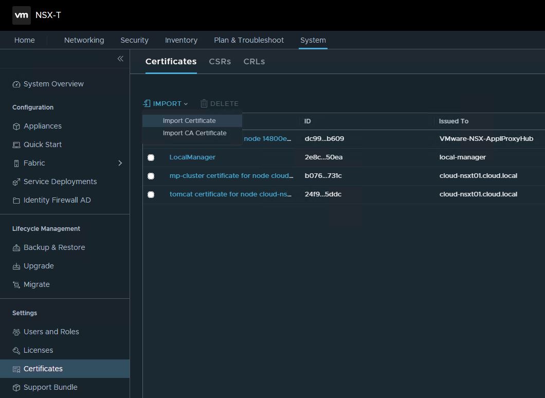 Import the VCD public certificate in the NSX-T Manager by navigating to System > Settings > Certificates > Import Certificate