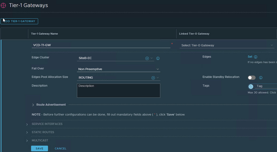 We can use the existing T1 gateway for VCD load balancing, but I have chosen to deploy a new T1 gateway dedicatedly to VCD. This T1 gateway must be instantiated on the Edge Cluster, as we will be configuring a load balancer, which is a stateful service.
