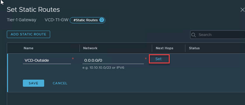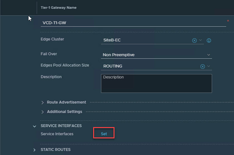 The VLAN-backed segment that we created in step-1 needs to be attached as a service interface on the T1 gateway. Edit the T1 gateway, expand Service Interfaces, and click on Set.