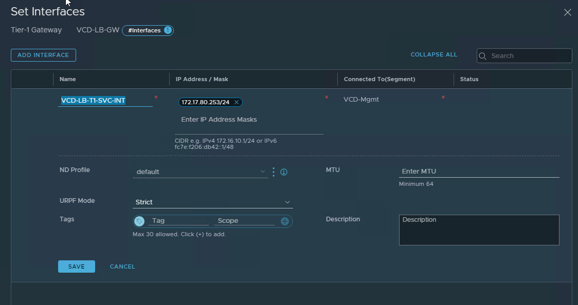 Click on Add Interface and map the interface to the logical segment. The IP address of this interface will be from the VLAN dedicated to VCD.