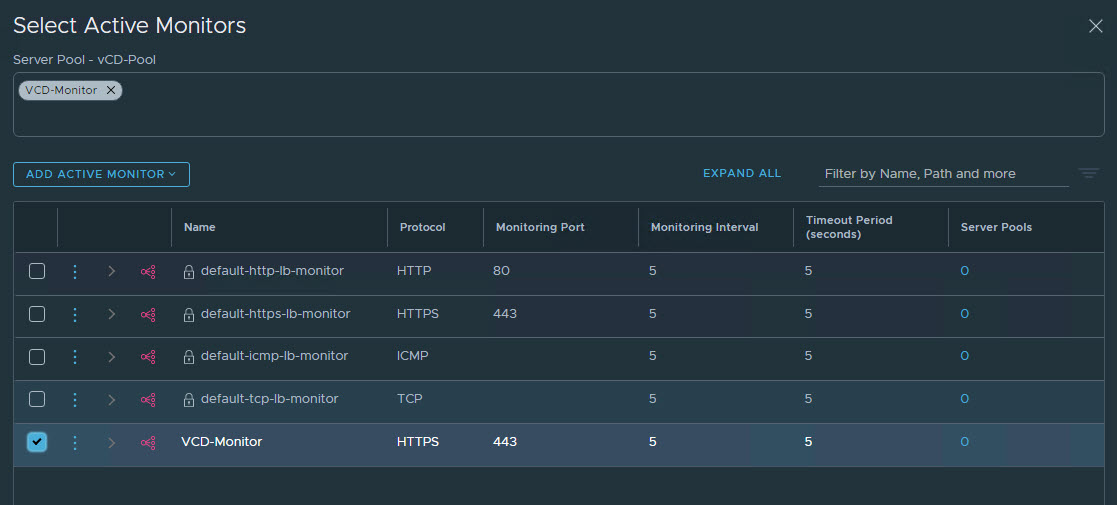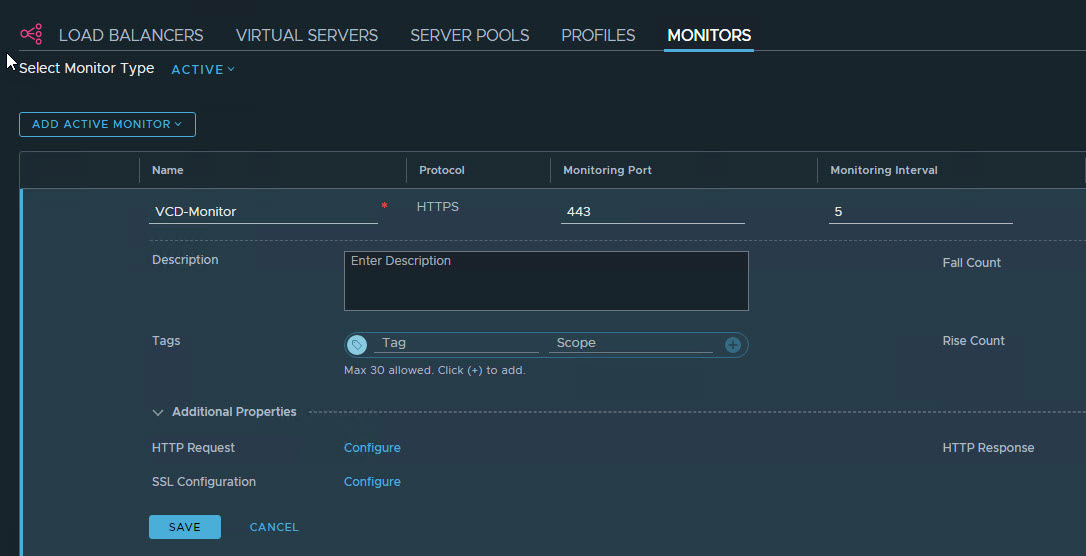 Create a new monitor by navigating to Networking > Load Balancing > Monitors > Add Active Monitor HTTPS