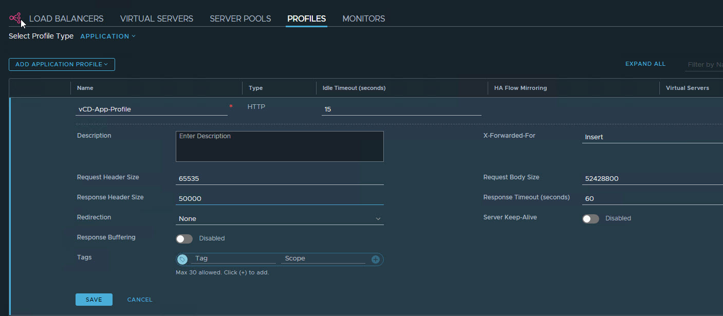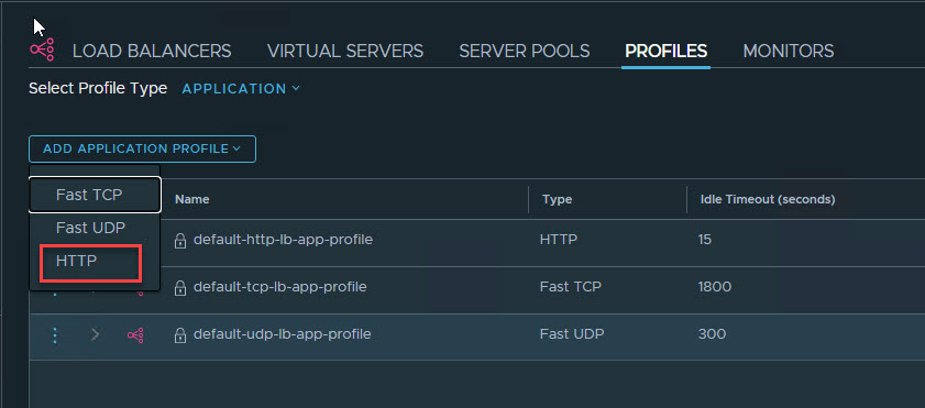 To add an application profile, navigate to Networking > Load Balancing > Profiles > Add Application Profile > HTTP