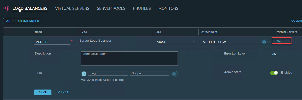 Now we can create a load balancer instance and associate the virtual servers with it. Create the LB instance on the Tier 1 Gateway, which routes to your VCD cell network. To add a load balancer, navigate to Networking > Load Balancing > Load Balancers > Add Load Balancer