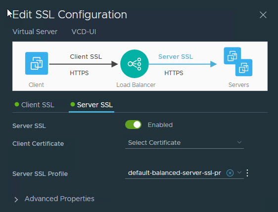 - Server SSL: Enabled, Client Certificate: None, Server SSL Profile: default-balanced-server-ssl-profile