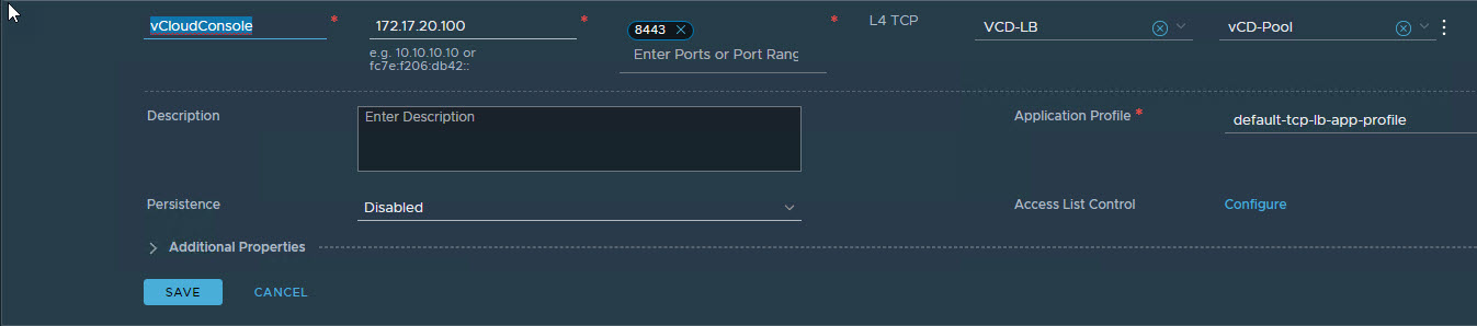 - Provide a name for the LB and select the T1 gateway that you created dedicatedly for VCD.
