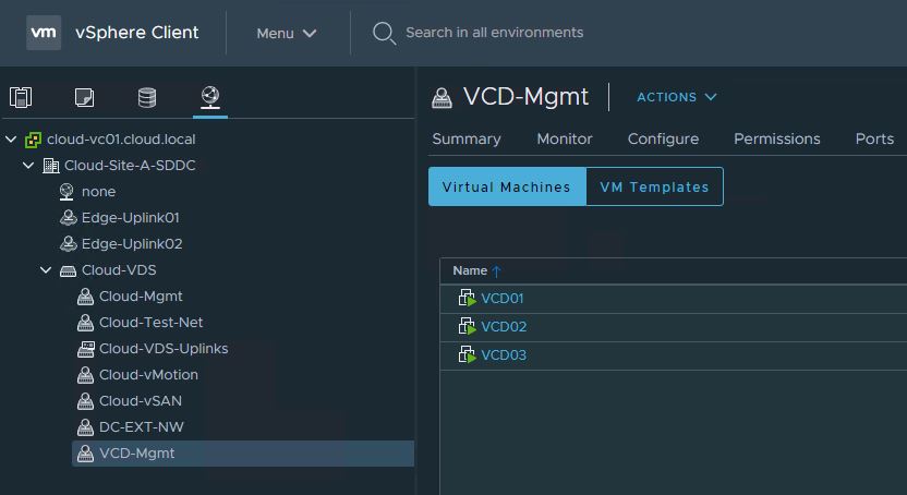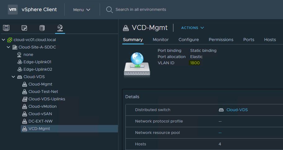 In my lab, NSX-T follows the VDS + NVDS architecture. The management SDDC, where VCD cells are deployed, has a VDS named ‘Cloud-VDS,’ and I have a dedicated distributed portgroup named ‘VCD-Mgmt’ which is backed by VLAN 1800, and all my VCD cells are connected to this portgroup.
